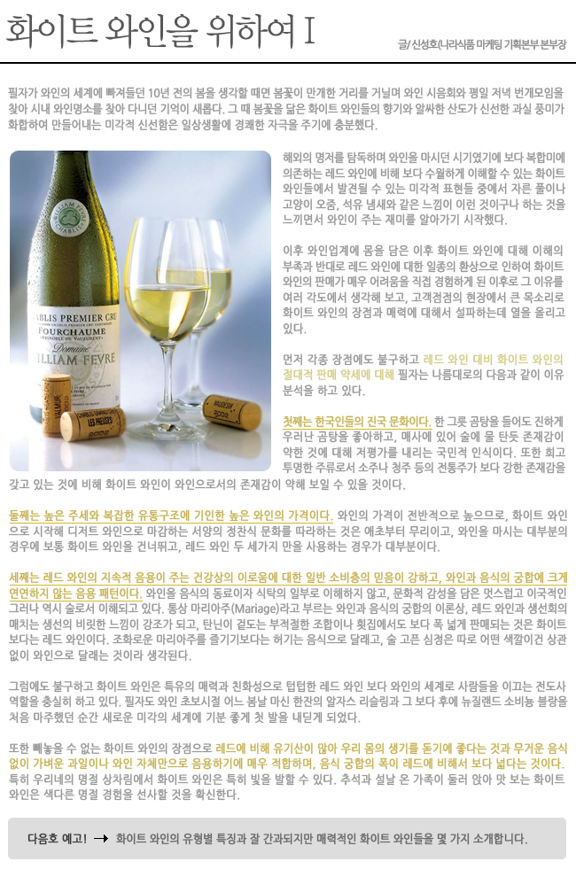 칼럼 | 화이트 와인을 위하여 I - 신성호 본부장(나라식품 마케팅기획본부) 페이지 정보 작성자 나라셀라 작성일2010-04-20 11:57 조회65,322회 관련링크 이전글 다음글 목록 본문 나라셀라 와인 화이트와인 이전글 다음글 목록